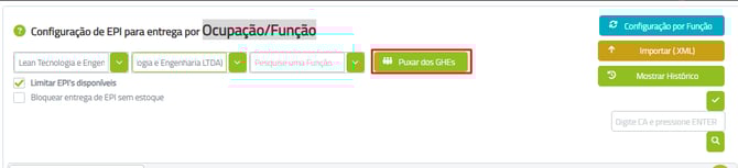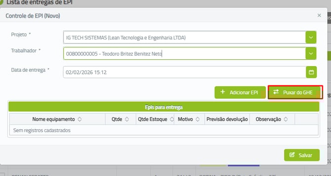 - Agora é possível entregar todos os EPIs configurados para a função do trabalhador de uma vez, com a opção de "Puxar do GHE"